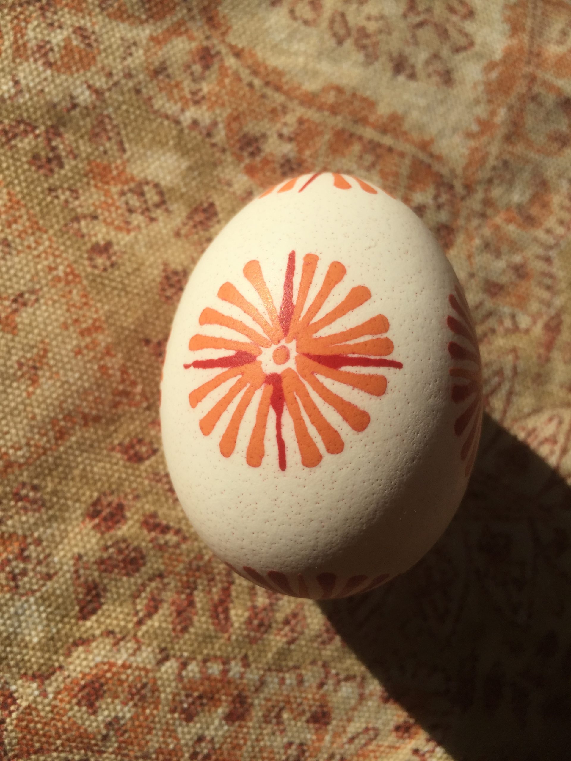 Here is what this egg looks like after writing (second dark red dye – sappan wood, and then vinegar etch):